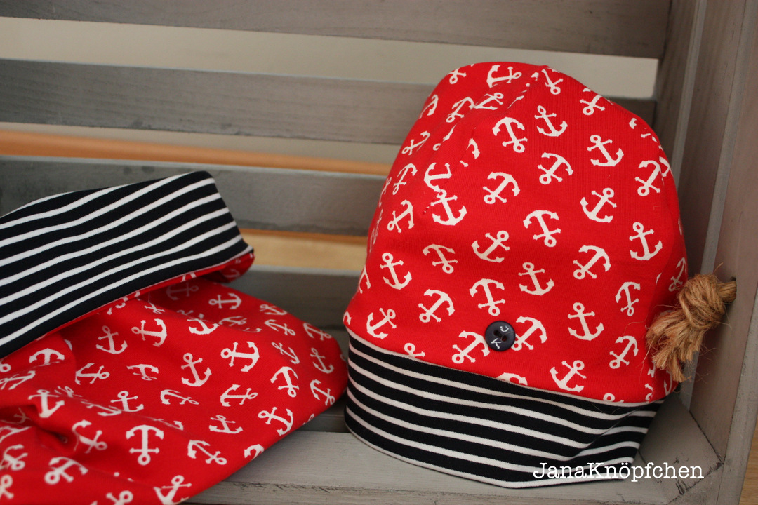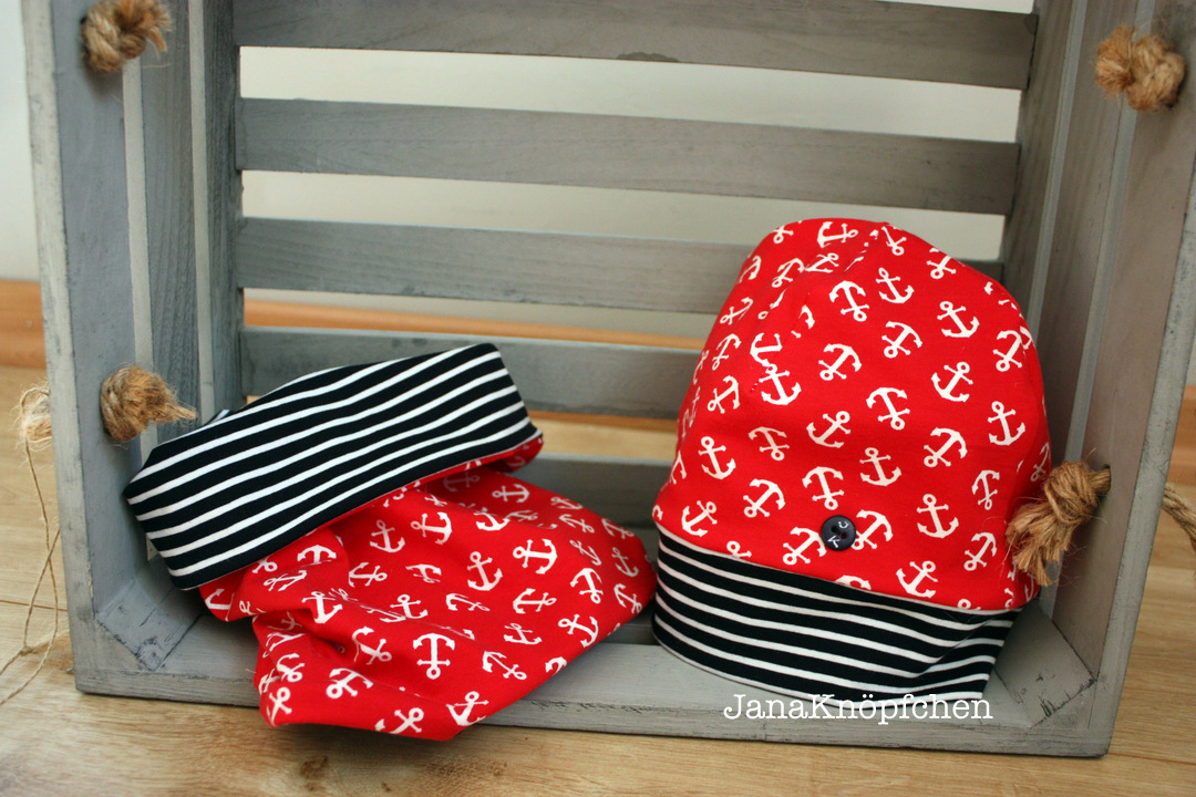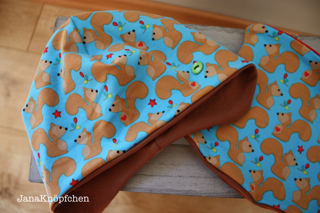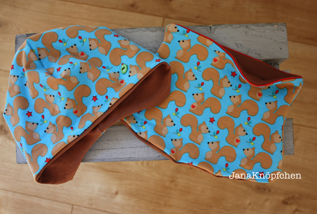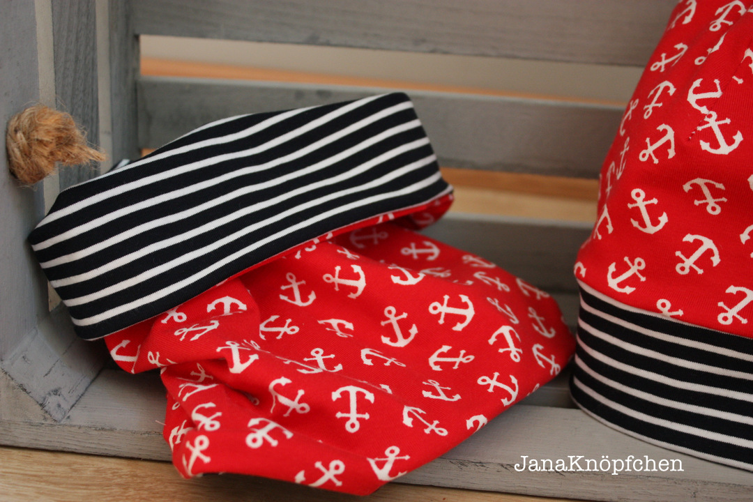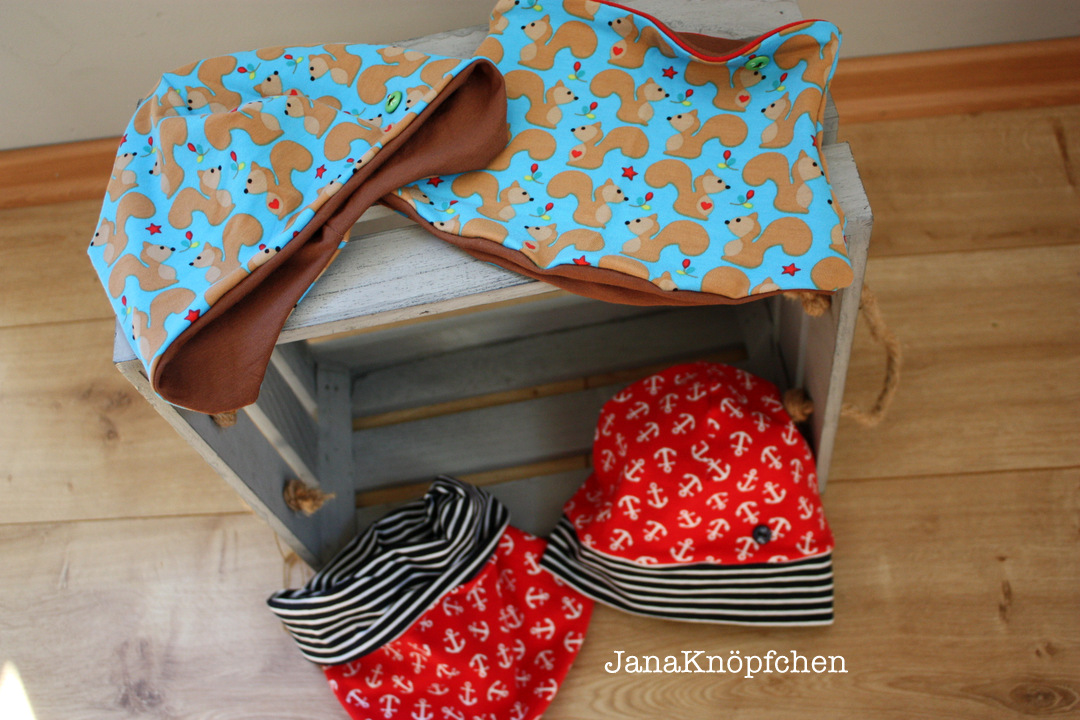 Der Kleine sollte einen Halssocke mit passender Mütze bekommen, dafür hatte ich schon den Eichhörnchenstoff im Kopf. Und der Große sollte den Schlupfschal mit passender Mütze bekommen, er wünschte sich den roten Ankerstoff, den ich mal in meiner Martha verwendet hatte.