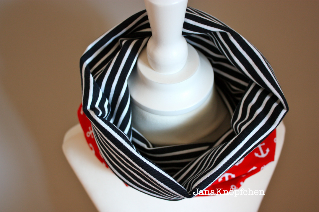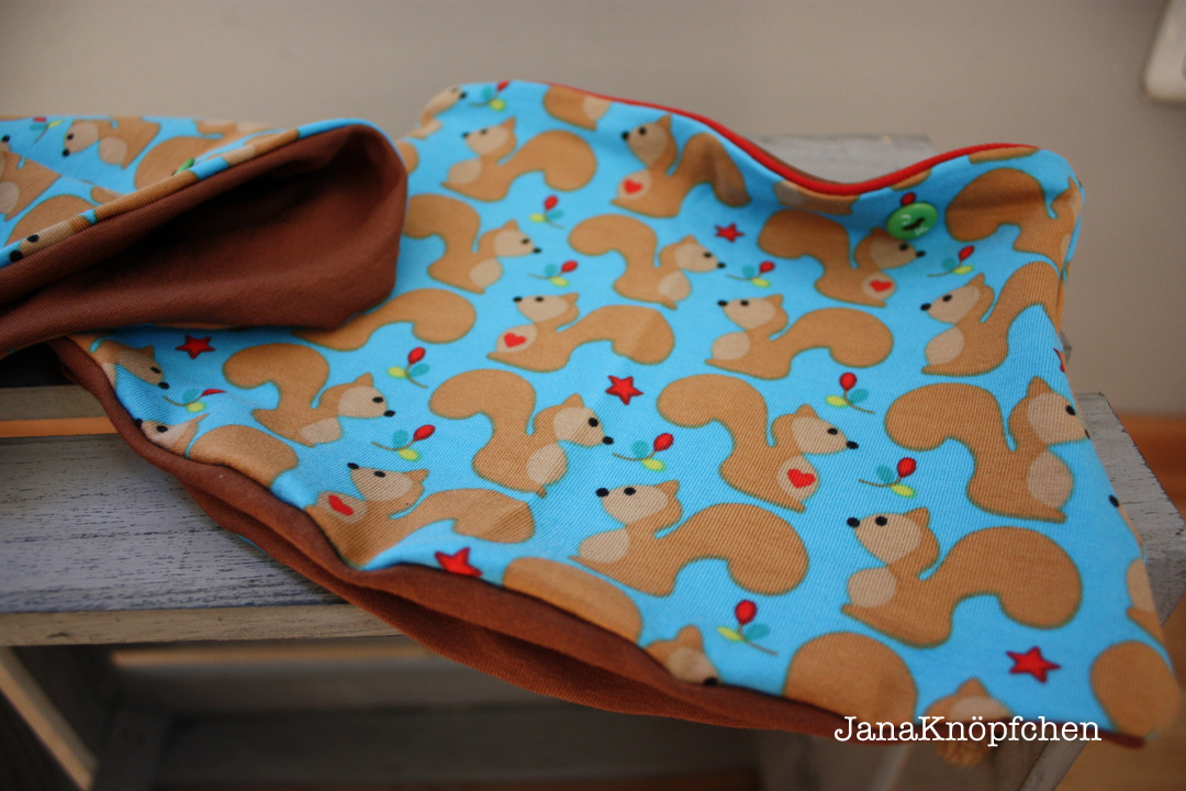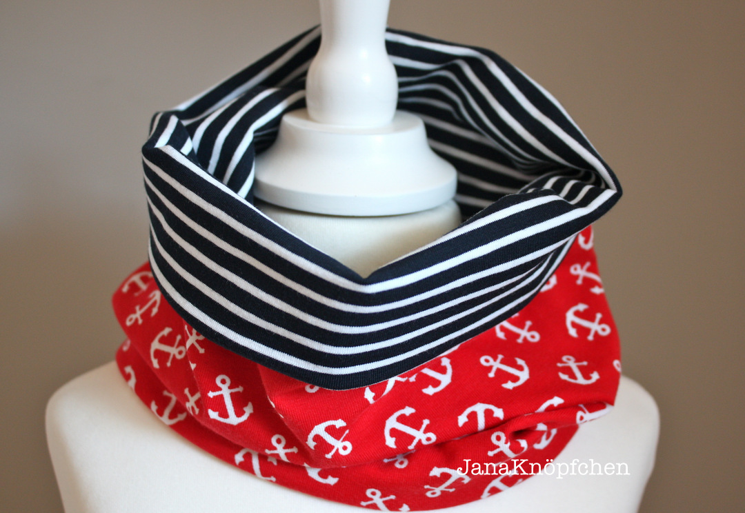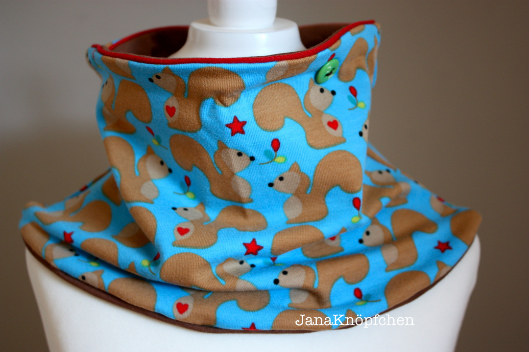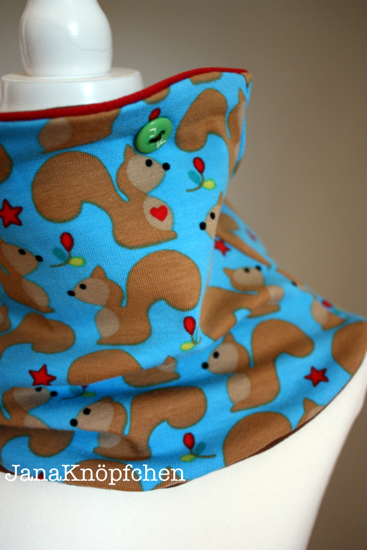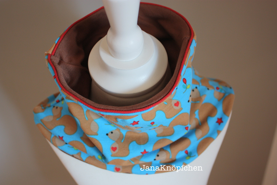 Der Kleine sollte einen Halssocke mit passender Mütze bekommen, dafür hatte ich schon den Eichhörnchenstoff im Kopf. Und der Große sollte den Schlupfschal mit passender Mütze bekommen, er wünschte sich den roten Ankerstoff, den ich mal in meiner Martha verwendet hatte.