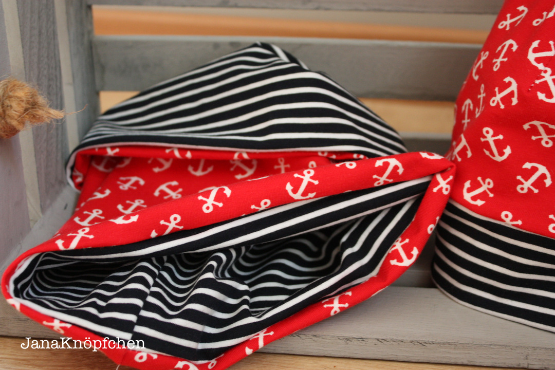 Der Große wünschte sich ja den Ankerstoff, also kombinierte ich hier einen blau/weiß gestreiften Jersey als Futterstoff. Die Mütze ist eine einfache Beanie, auch innen gefüttert mit Jersey – beides ist so richtig maritim, wie ich es mag…