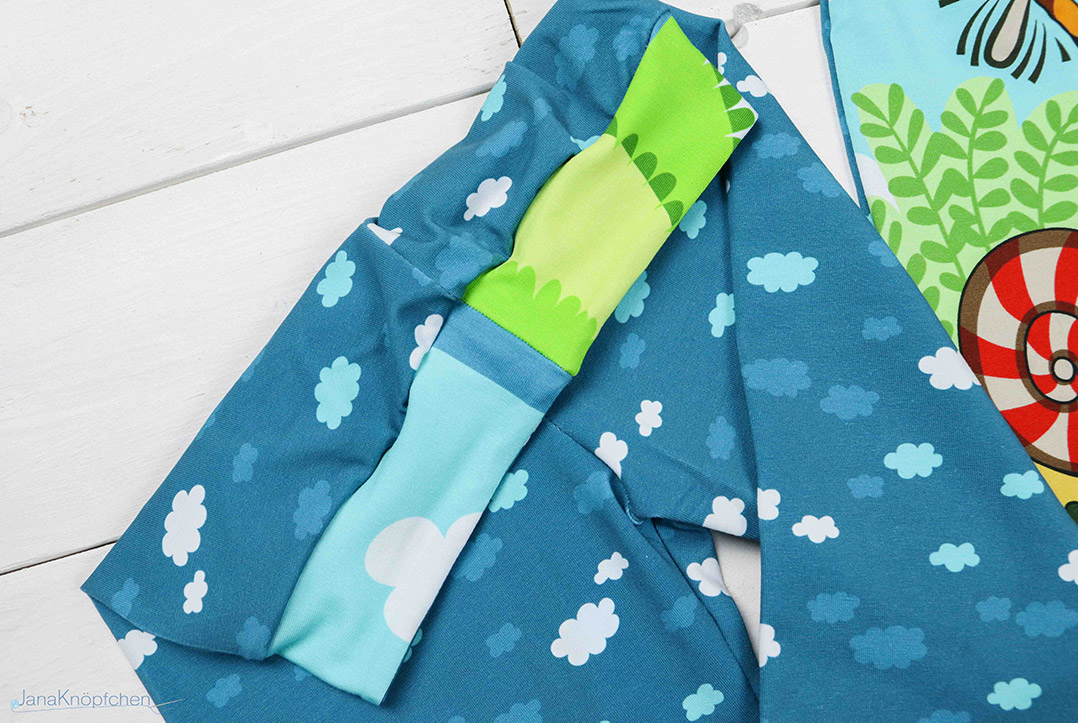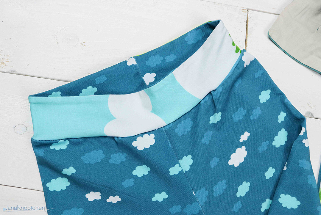 Von dem Wolkenstoff hatte ich noch ziemlich viel übrig also war klar, dass die Ärmel, das Rückenteil und die Hose aus dem Wolkenstoff genähte werden. Auch hier wollte nur den vorhandenen Stoff verwenden und schnitt das Bündchen für die Hose aus den Resten des Pauli-Panels und ein paar Stücken des restenlichen Wolkenstoff zu. Auch für das Halsbündchen verwendete ich den Rest des Panel-Stoffes und so ist es entgegen des Fadenlaufs und mit einem Zentimenter mehr Nahtzugabe zu geschnitten. Da es sich ja nicht so dehnt wie richtig zugeschnittener Jersey.