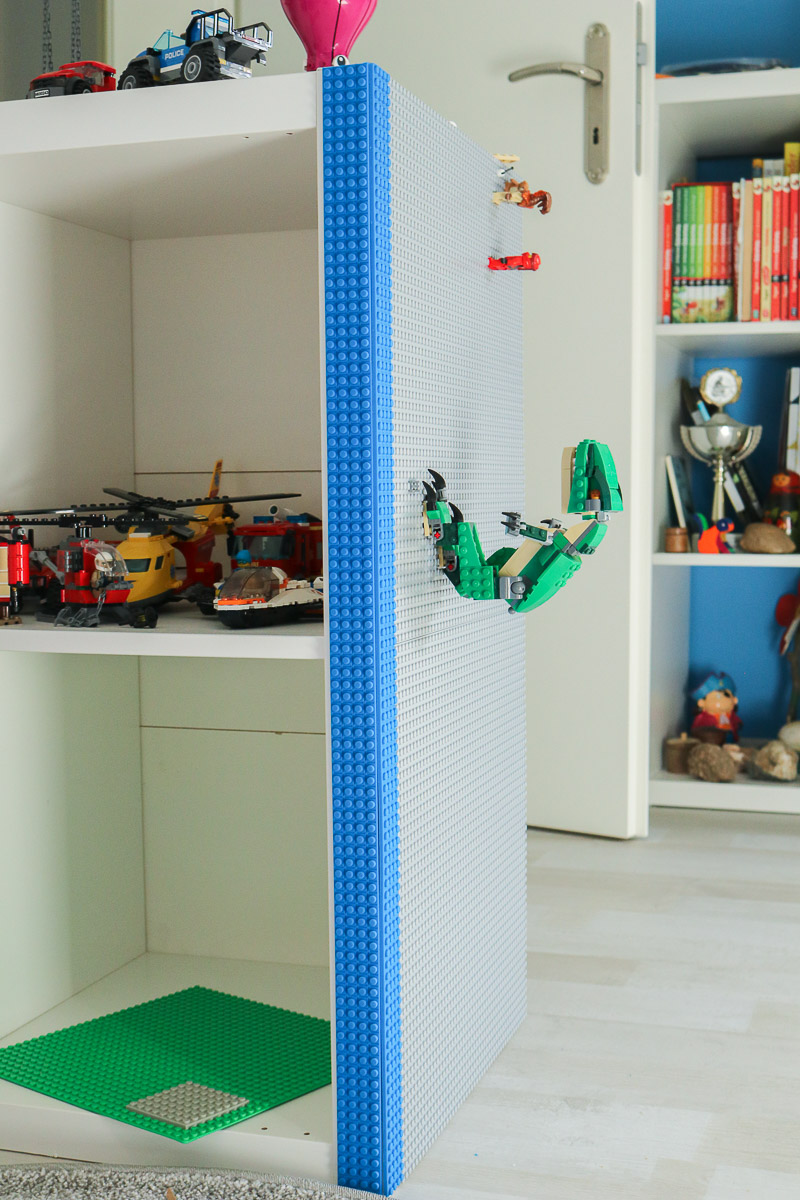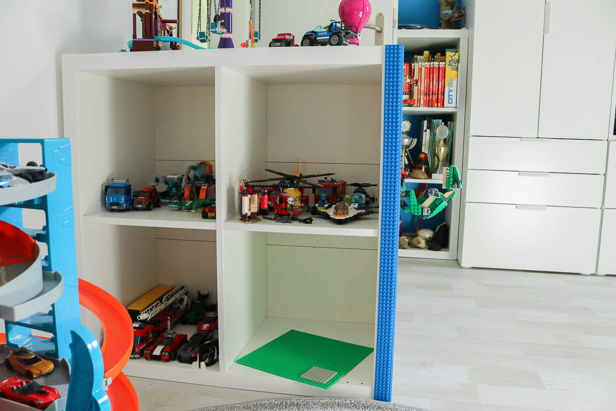 Da die Regalböden dicker als so eine normale Rückwand sind, passten nur an der Seite die Grundplatten nicht mehr ganz genau, so dass ich hier einen kleinen Versatz von 3 cm hatte. Über Instagram bekam ich den Tipp ein Klebeband für LegoBausteine* dort anzukleben. Eine super Idee, die wir dann umsetzten. Der Lütte entschied sich für die Farbe blau.