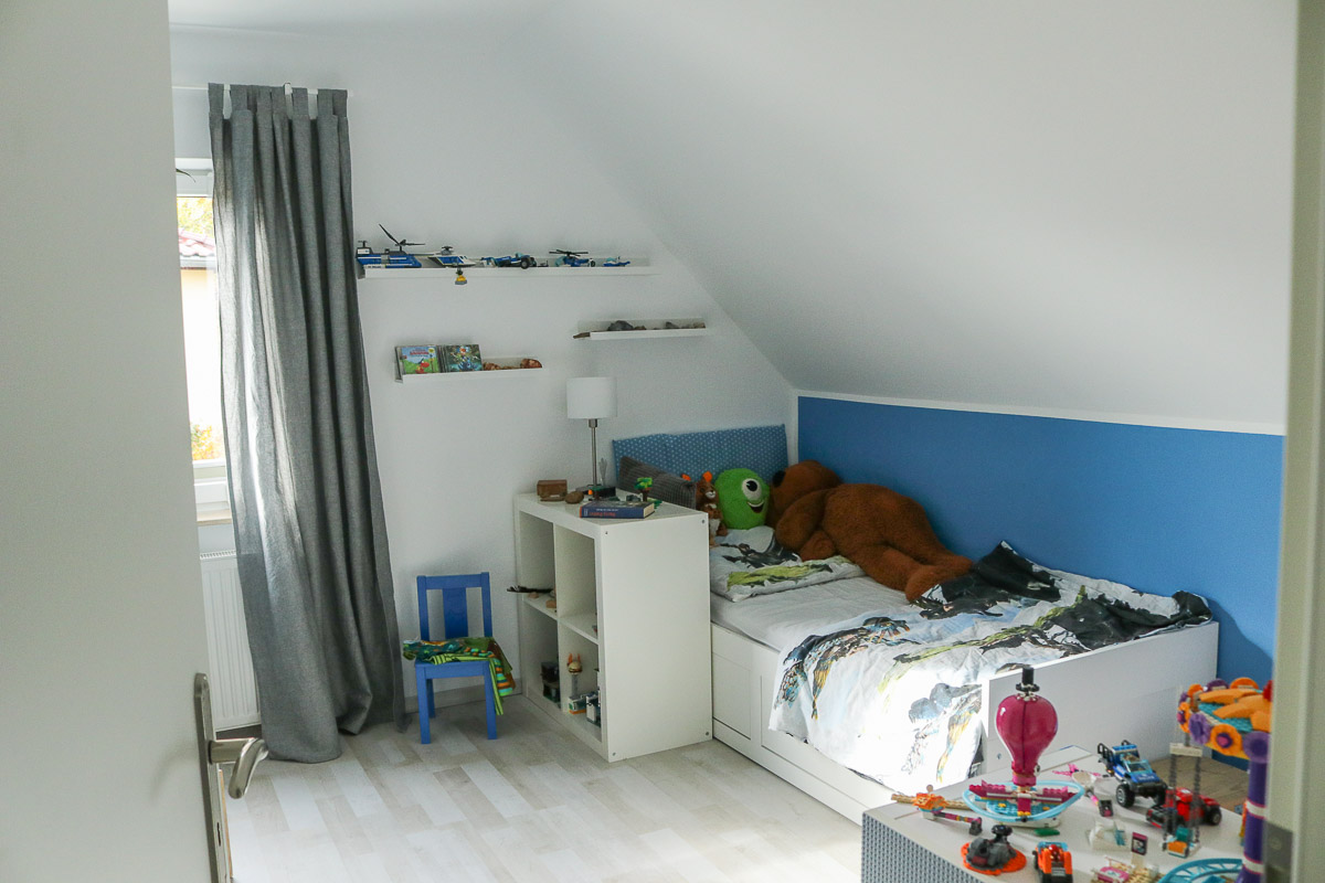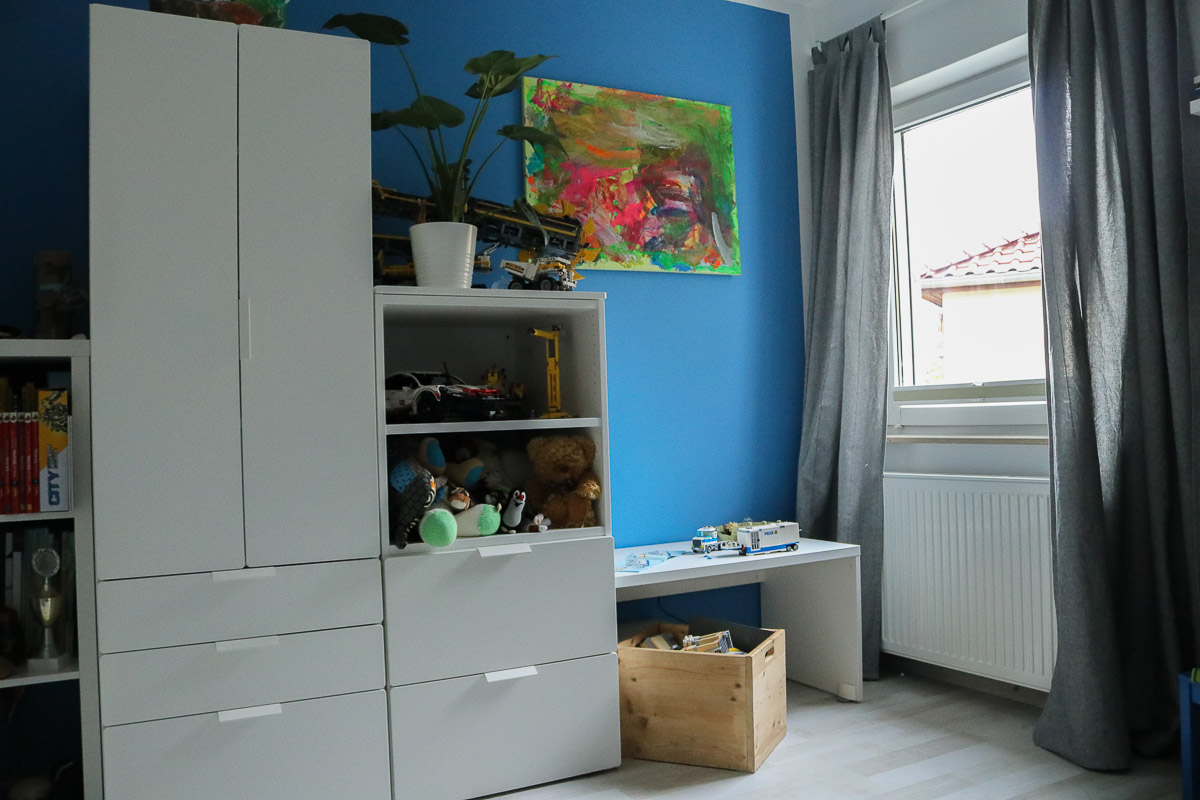 Nach ungefähr 1 1/2 Jahren wollte der Große mit seinem Bruder in einem Zimmer schlafen und wir stellten hier sein Bett sowie das Babybett des Lütten rein. Das klappte auch gut und die Jungs hatten ein Schlaf- und ein Spielzimmer. Nach wiederum 1 1/2 Jahren und der Einschulung des Großen, wollte dieser wieder zurück in sein Zimmer und er bekam damals auch sein Fußballzimmer. Also wurden das Zimmer des Lütten wieder umgestellt und eigentlich zur Aufbewahrung von Spielzeug, Kuscheltieren und Sachen benutzt. Geschlafen hat er dann wieder bei uns, was auch mit dem Wechsel von Krippe zu Kita zu tun hatte. Das möchte ich nicht weiter ausführen, es war nicht einfach und wir hatten nichts dagegen.