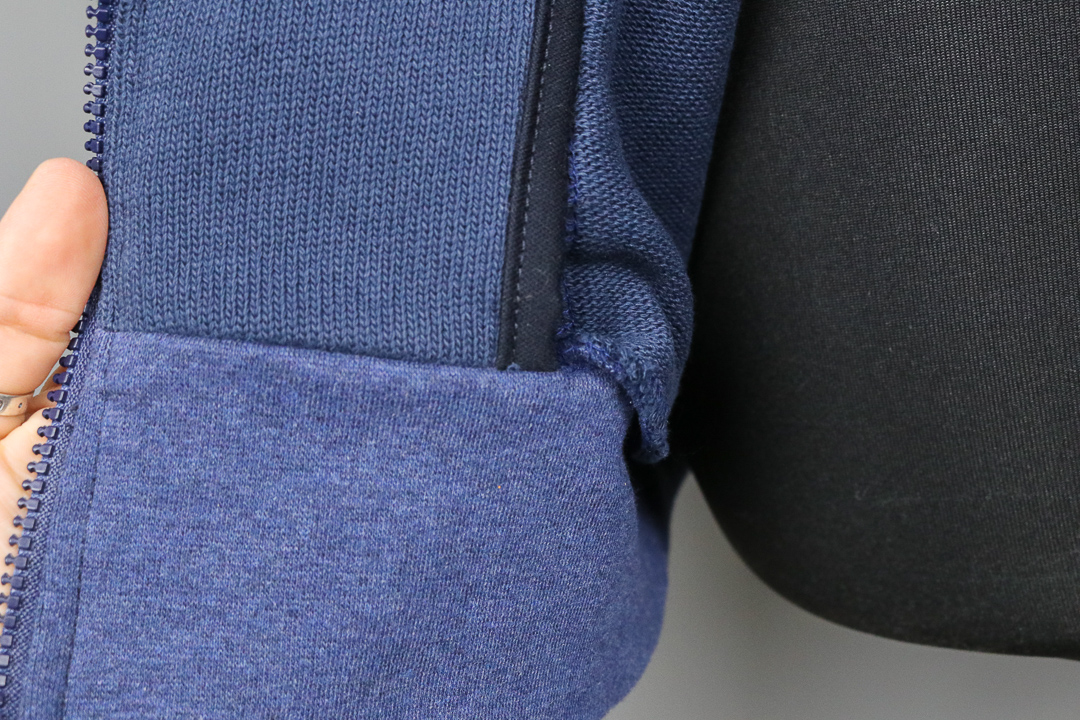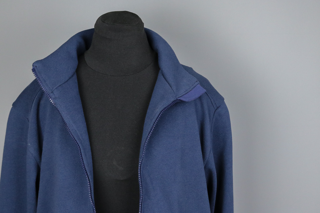 Eigentlich gab es eine Foto- bzw. schriftliche Anleitung für die Jacke, aber da ich sie innen mit einem Beleg nähen wollte, nähte ich die Strickjacke ohne Anleitung. Den Beleg nahm ich von dem Schnitt Jordan von Pattydoo und schnitt ihn etwas länger zu, da ich die genauen Maße noch nicht wusste. Den Beleg wollte ich versäubern und stöberte in meinem Stoffregal. Hier fand ich einen passenden blauen Baumwollstoff. Diesen hatte mir mein Großonkel mal vor Jahren mit anderen Stoffen geschenkt – aus einem habe ich mir 2017 eine Faltenrock als Weihnachtsoutfit genäht.