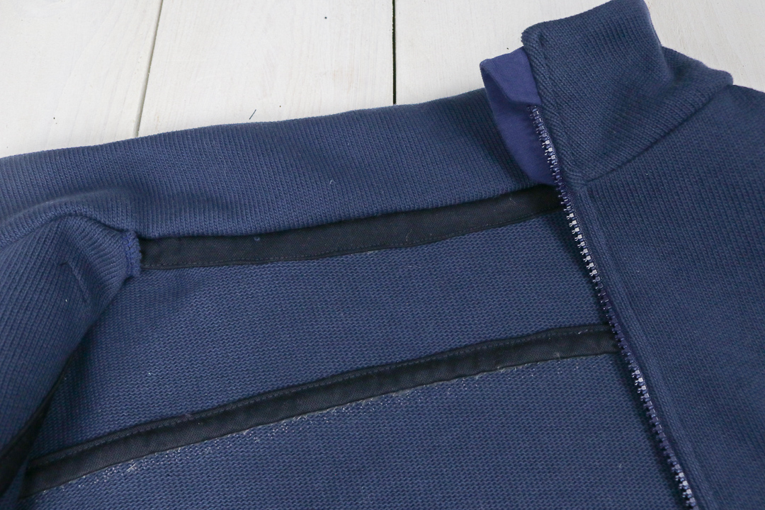 Dann entschied ich mich, den Stoffstreifen im Schatten der Naht festzunähen, dann umzuklappen und dann mit einer Naht die Nahtzugabe zu befestigen. Jetzt gefiel mir die Naht auf der Rückseite und das noch zusehende Formband schnitt ich ab. Deshalb sieht man auf den Bildern, noch kleine Klebereste, die sich mit dem Waschen aber auflösen. Nun konnte ich endlich die Strickjacken weiter nähen.