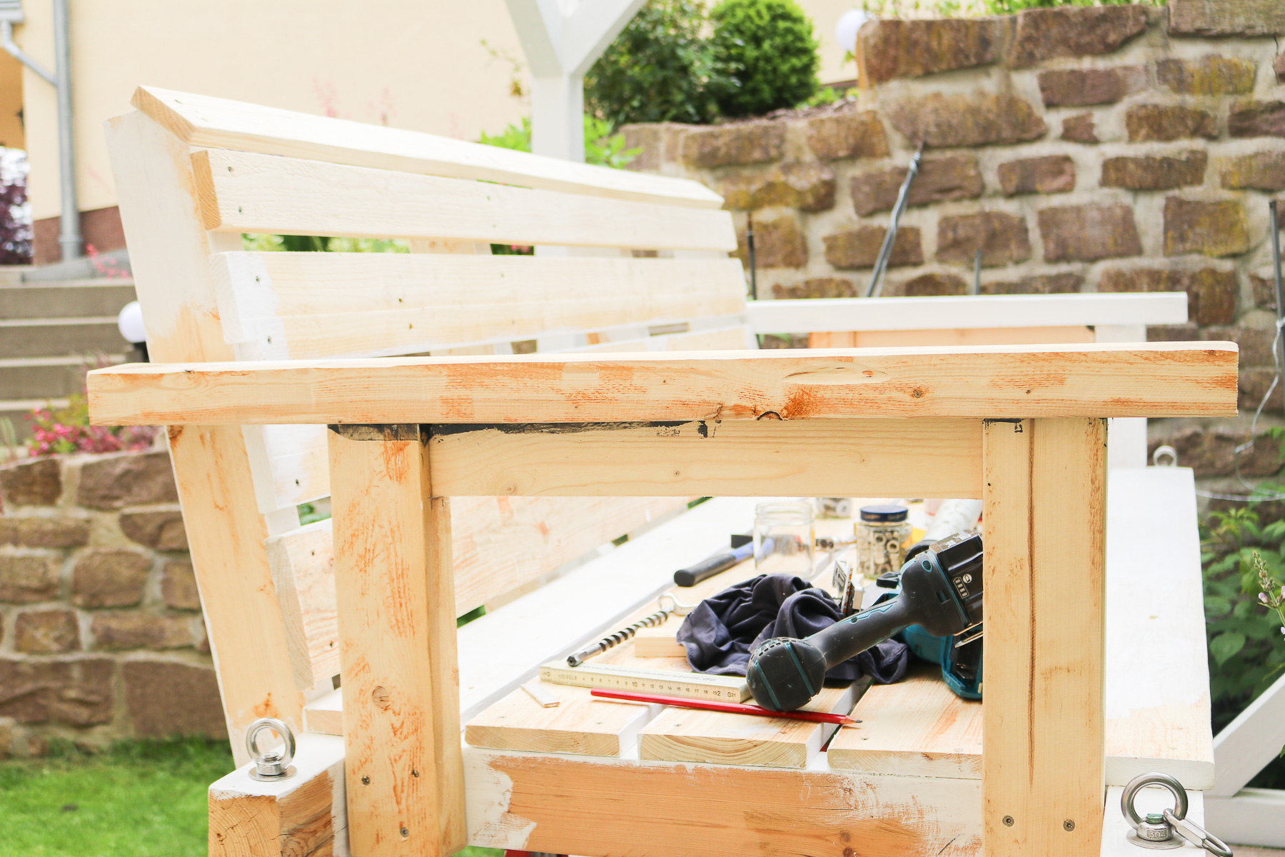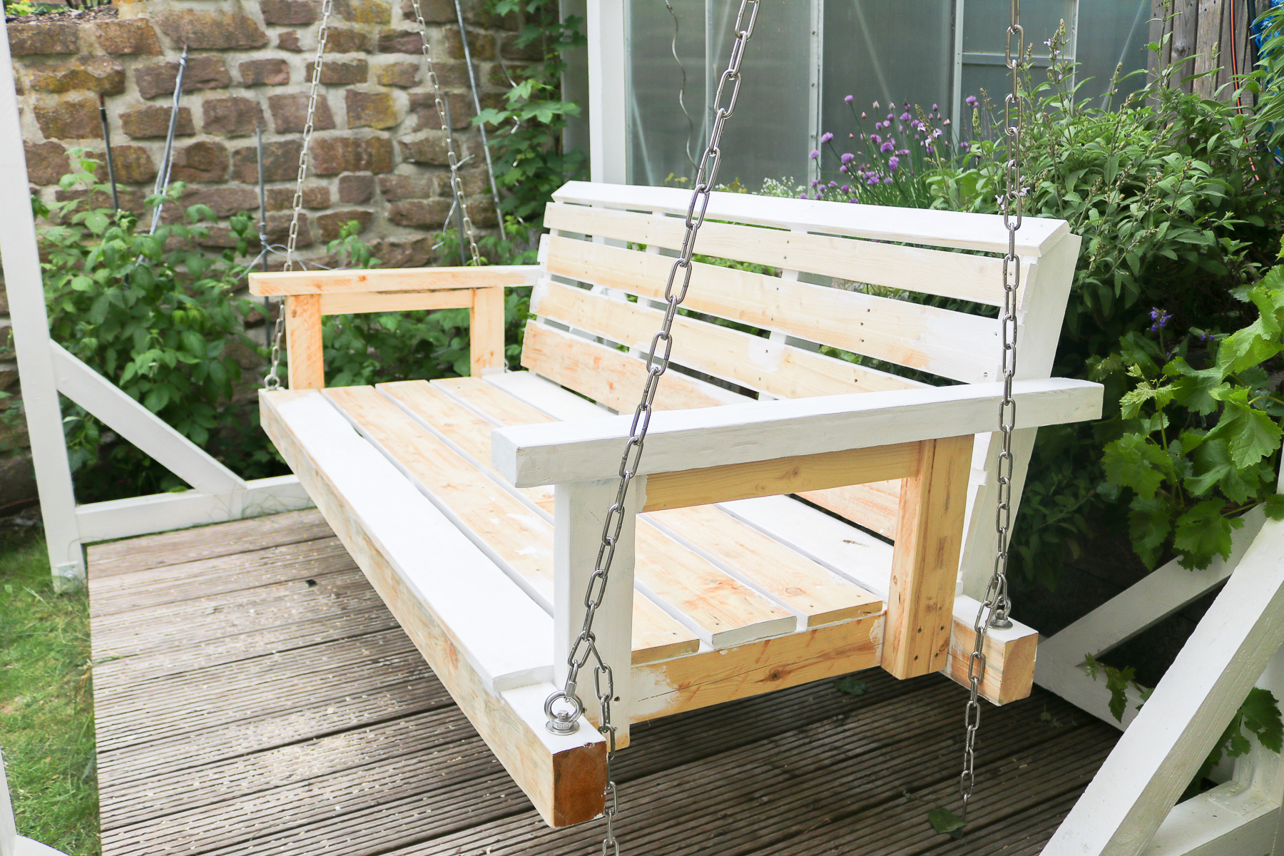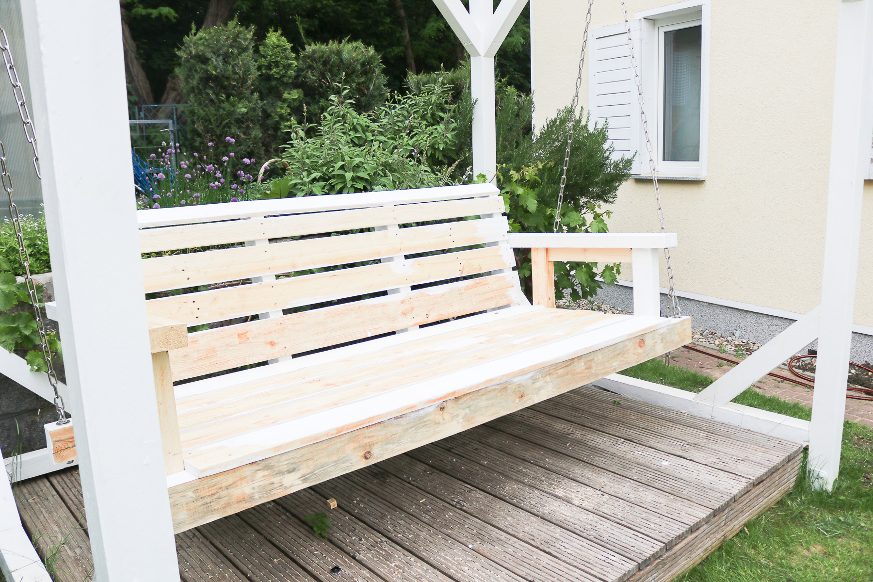 Nachdem die Gartenschaukel soweit fertig war, drehten wir sie und hingen sie an die bereits befestigten Ketten. Dann wurden wieder geschliffen, damit wir streichen konnten. Das Wetter hielt zum Glück, so dass wir den ersten Anstrich am Samstag und den zweiten dann am Sonntag machen konnten.