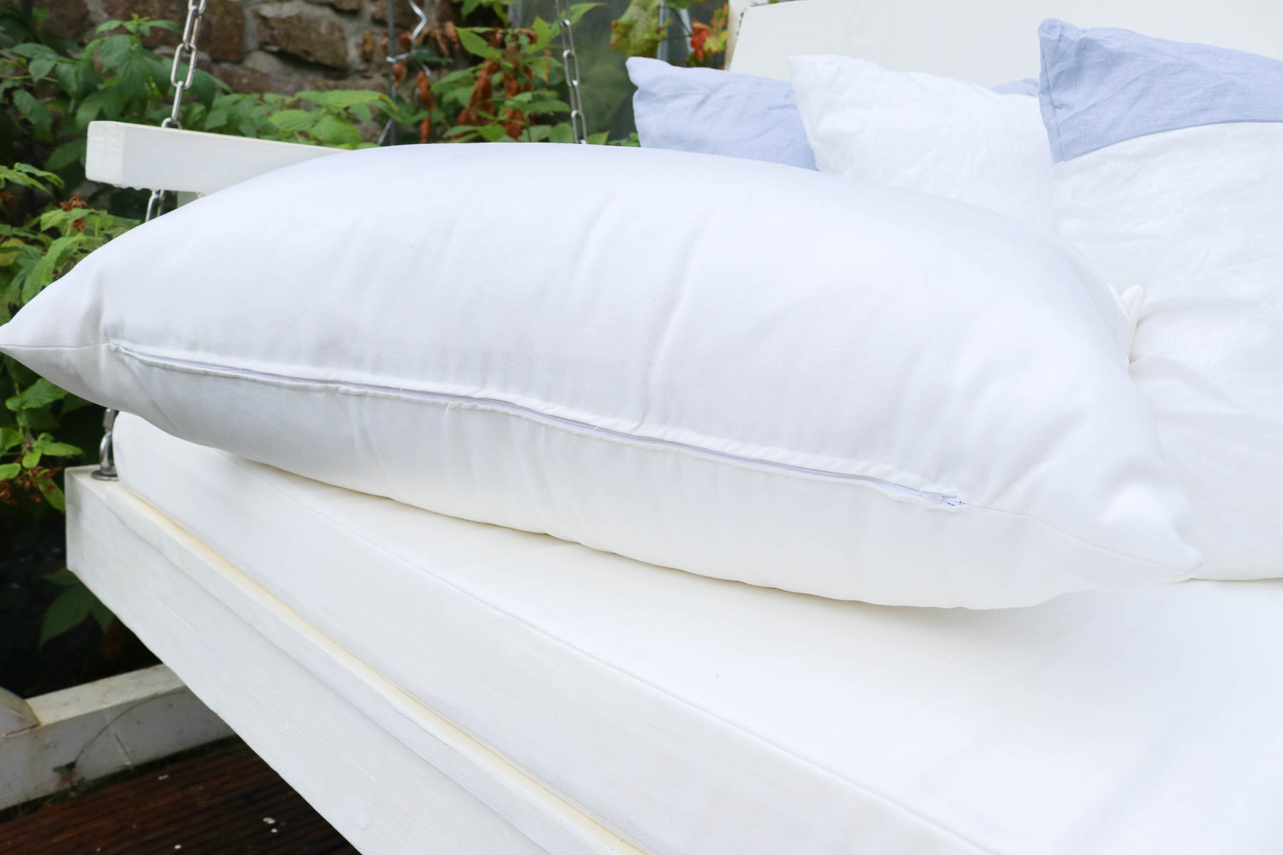 Also begab ich mich auf die Suche nach dem passenden Kisseninlett, was gar nicht so leicht war und sicher auch an unterschiedlichen Vorstellungen seitens meines Mannes und mir lag 😉 Er hatte sich ein großes, festes Kissen gedacht und ich einfach eines, dass in den Zwischenraum von Auflage und Armlehne passt. Also schaute ich nach Nackenrollen und bestellte welche. Als sie ankamen und ich sie auf der Gartenschaukel zeigte, war er nicht so überzeugt und dann stellen wir fest, was für unterschiedliche Vorstellungen wir hatte…