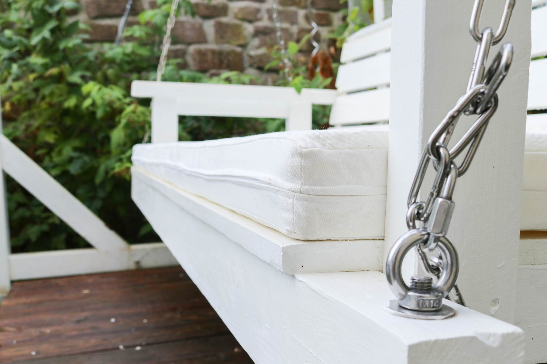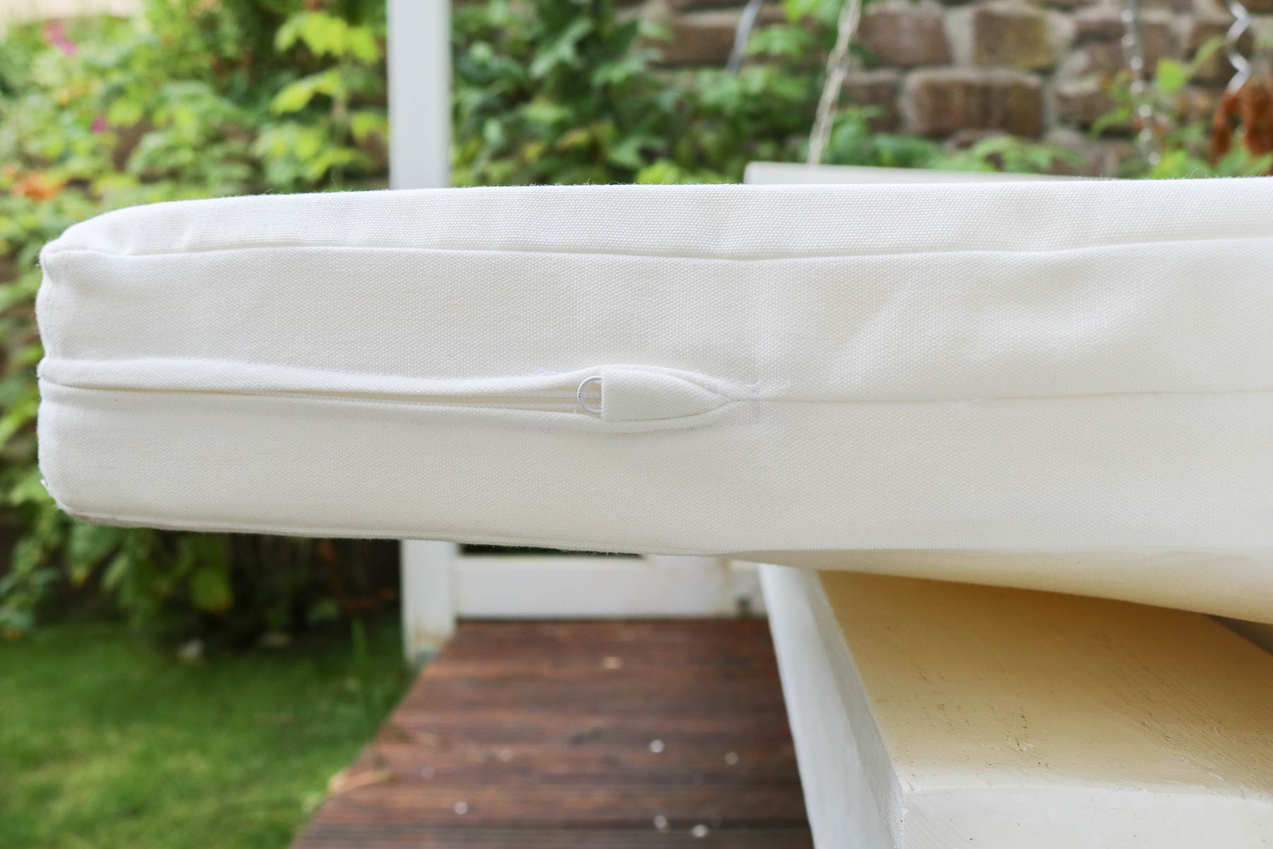 Die Lieferung ging schnell und wir legte die Auflagen probeweise auf die Schaukel. Die Sitzfläche war dem Mann etwas zu dünn und so bestellt ich noch eine Auflage in der Stärke 2cm so dass wir dann insgesamt eine Auflage mit der Stärke von 9 cm hatten. Die Rückenlehne blieb aber so.
