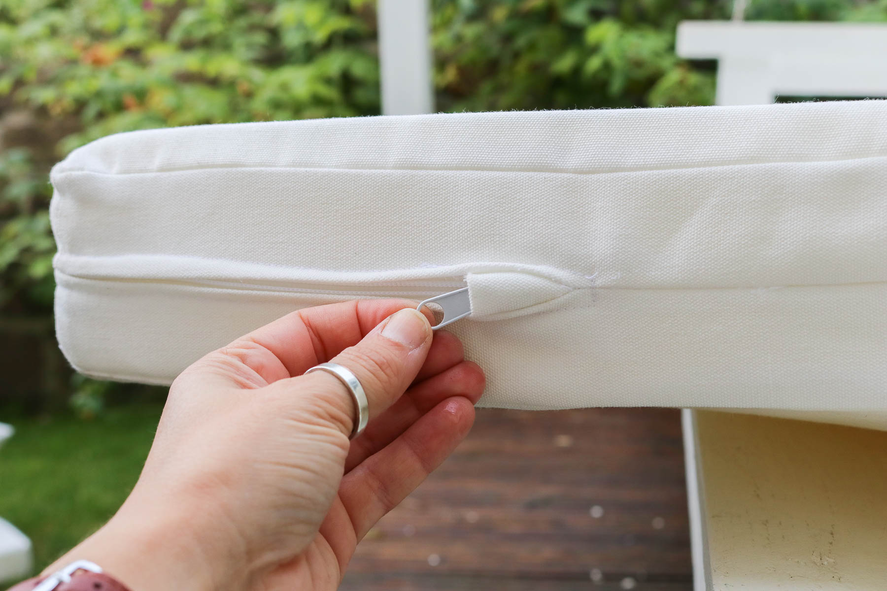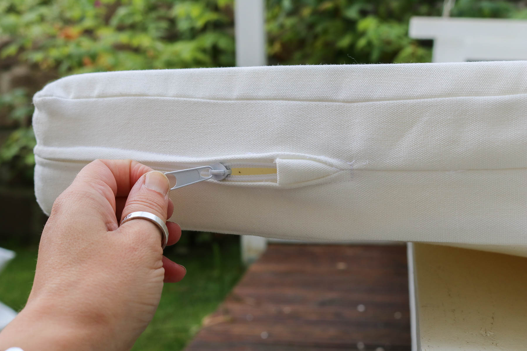 Die Kissen für die Armlehnen, bezog ich mit dem Rest des Markisenstoffes der Auflagen und nähte auch hier wieder einen Reißverschluss ein.