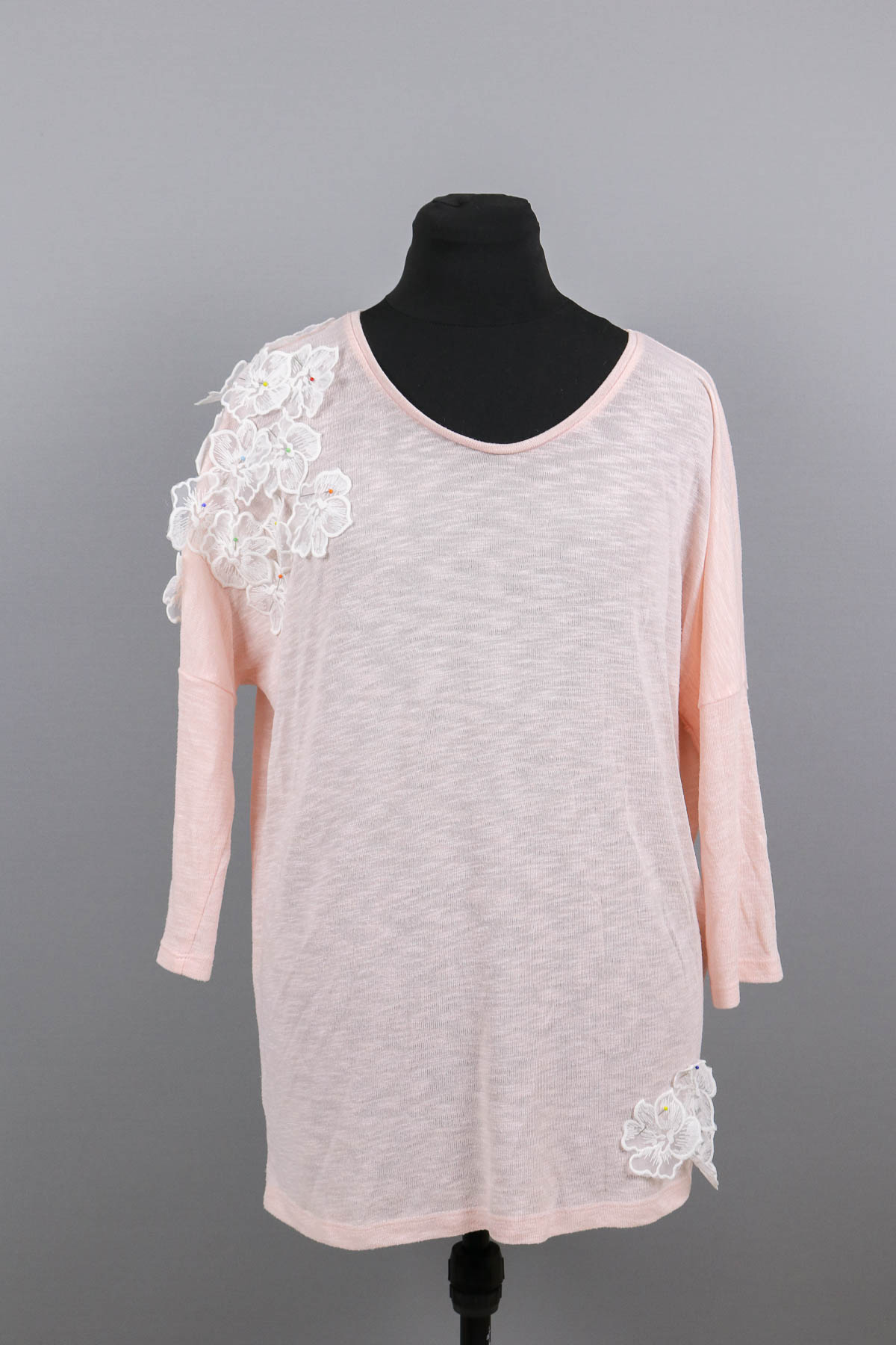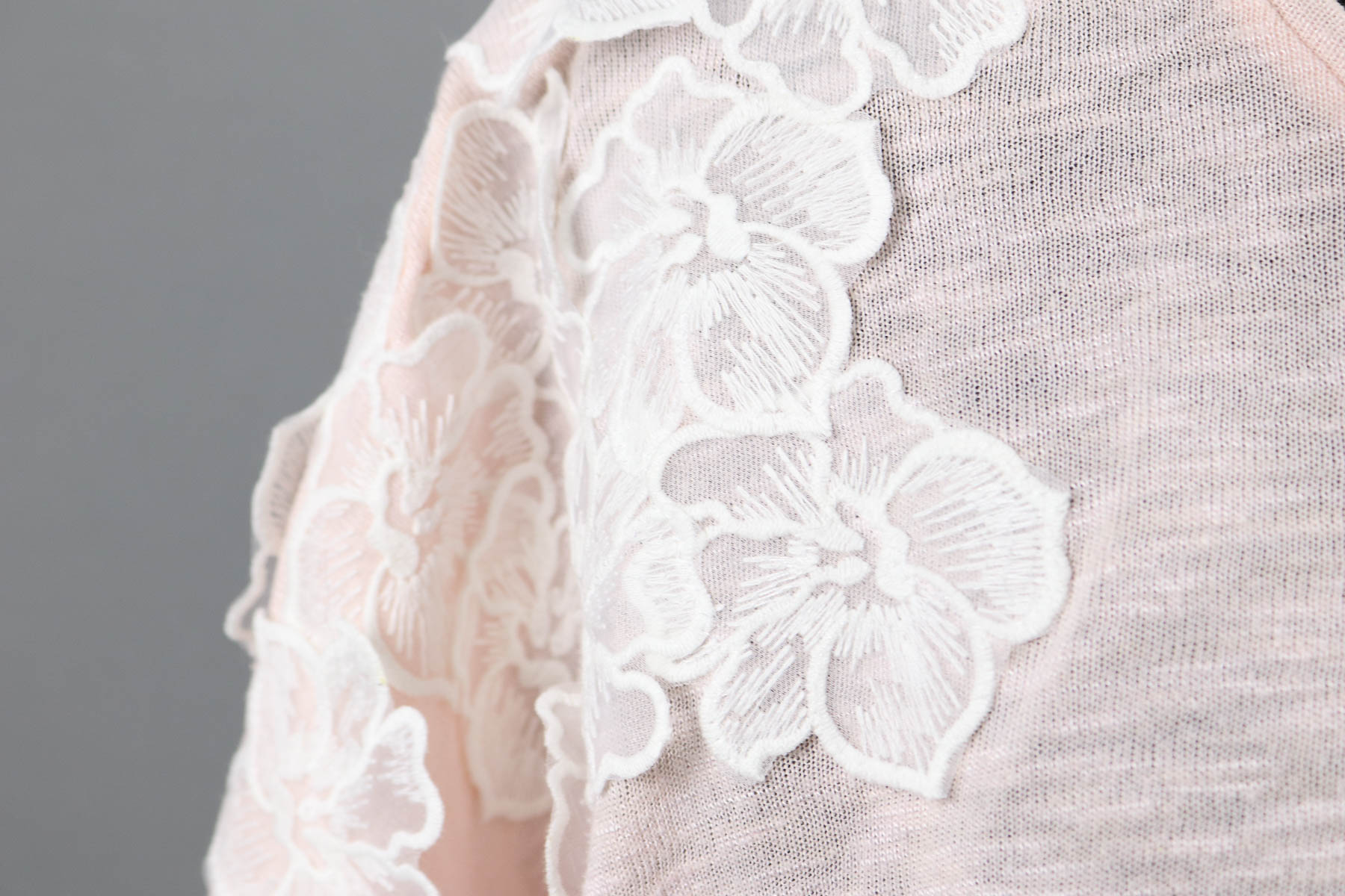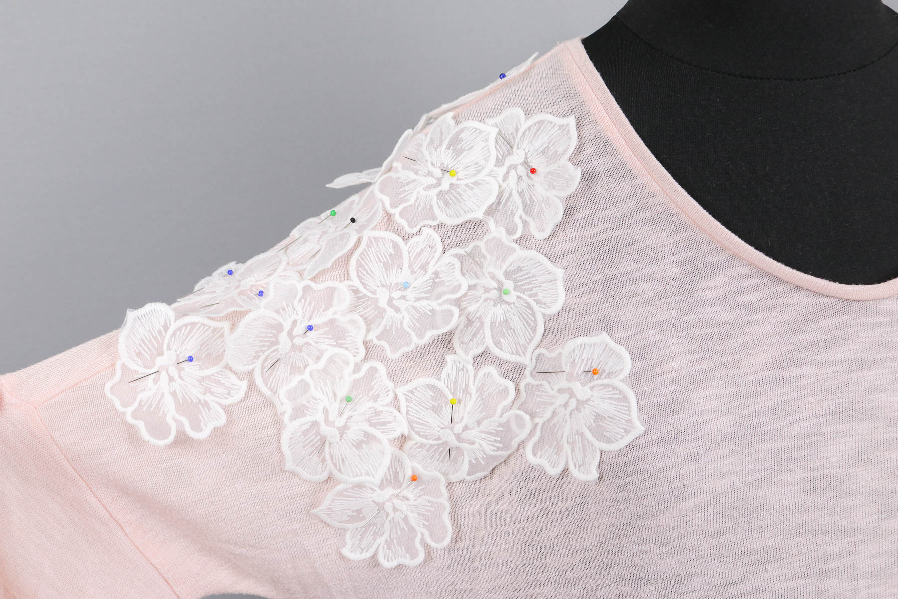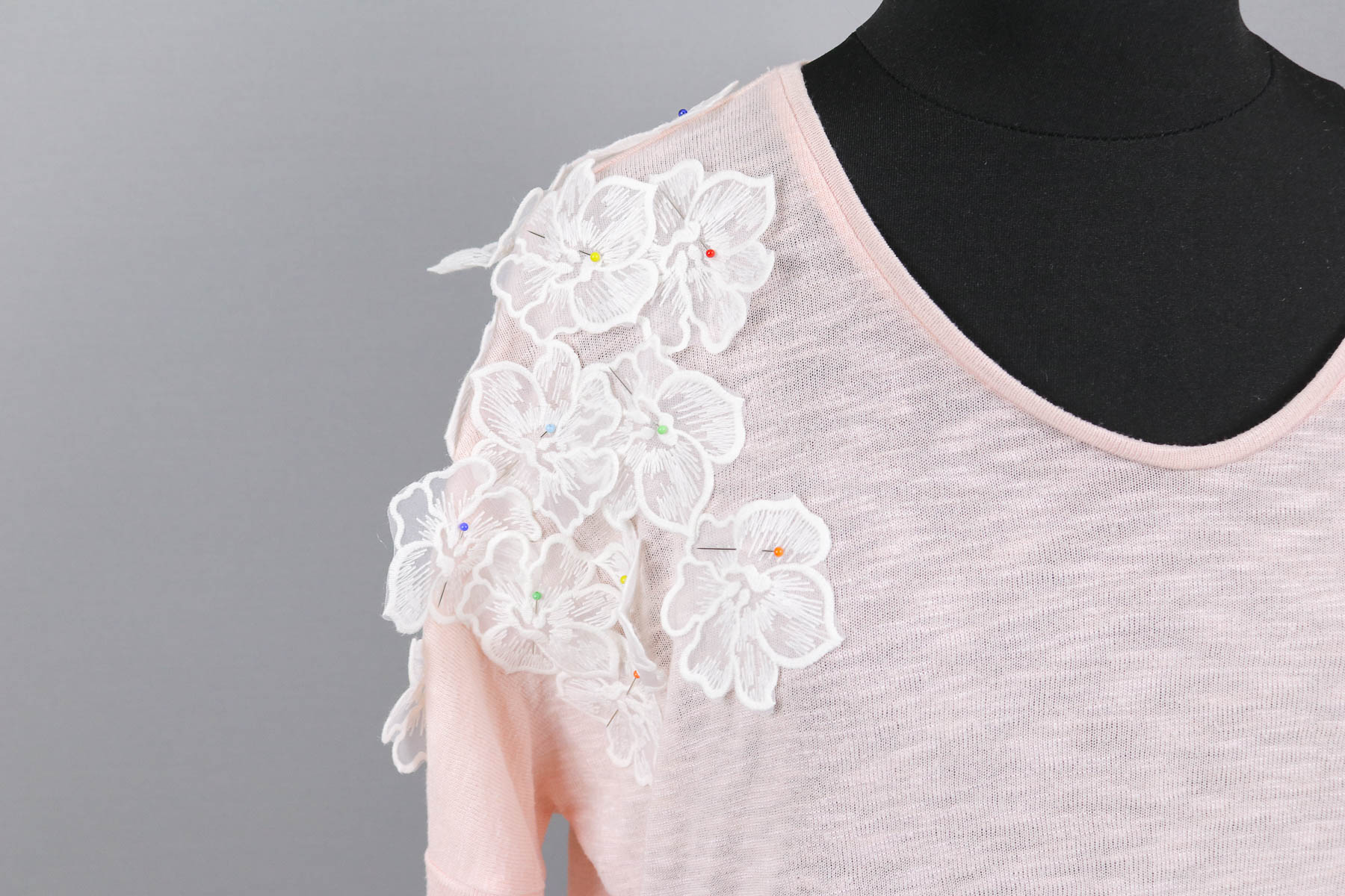 Wir verteilten die Spitzenblüten erst auf den beiden Flecken und vorn dort aus über das obere Vorder- und Rückenteil sowie auf dem Feldermausärmel. Dann probierte Susi das Shirt nochmal an. Ich steckte dann noch drei Blüten an den gegenüberliegenden Saum und fertig war die Verteilung.