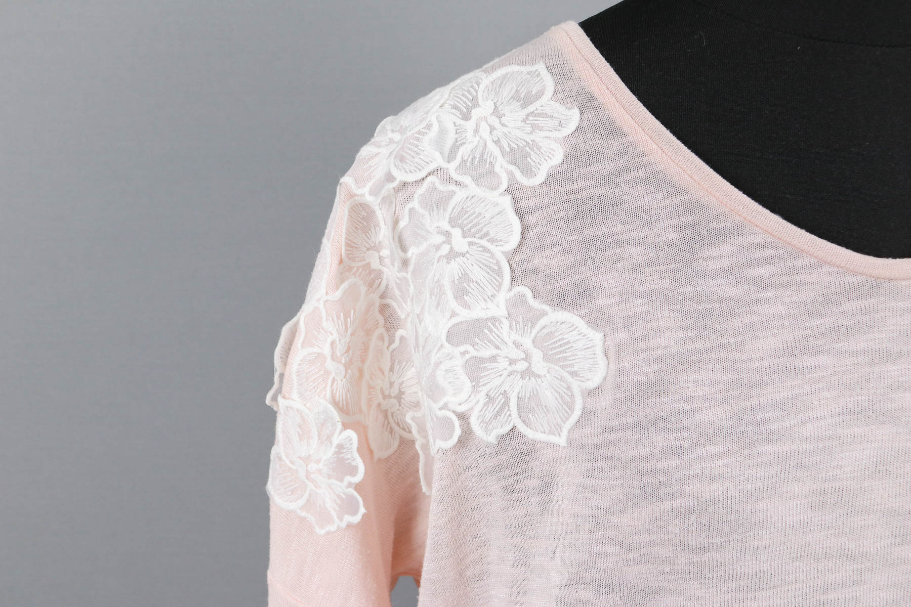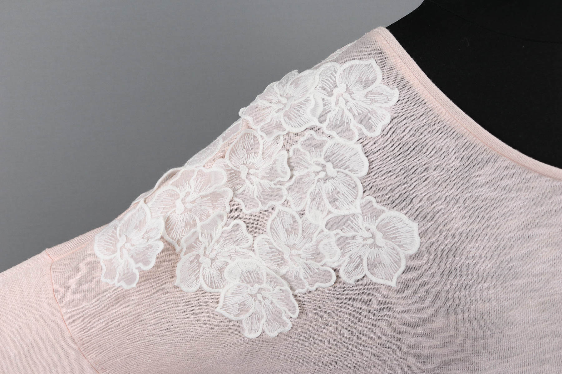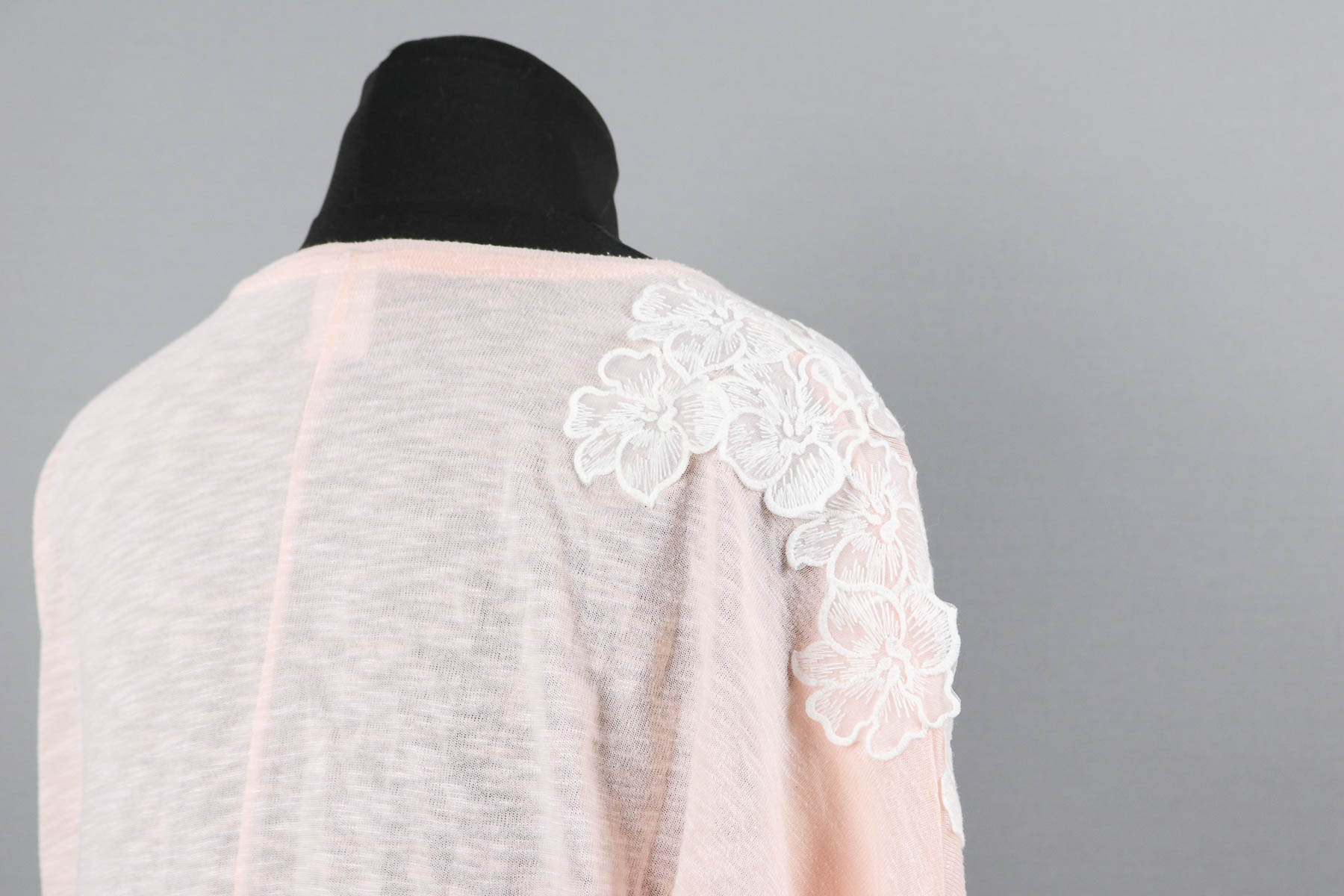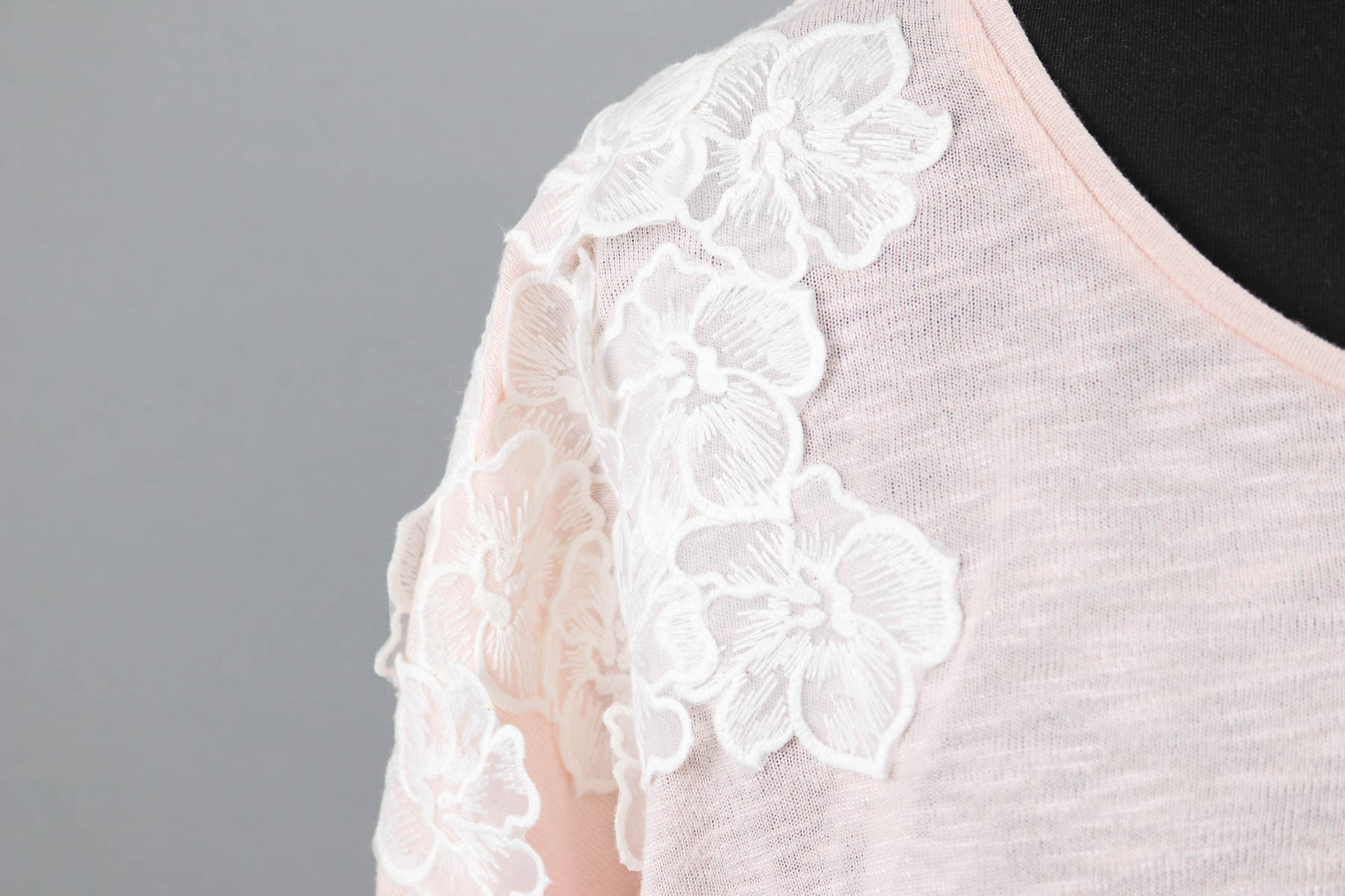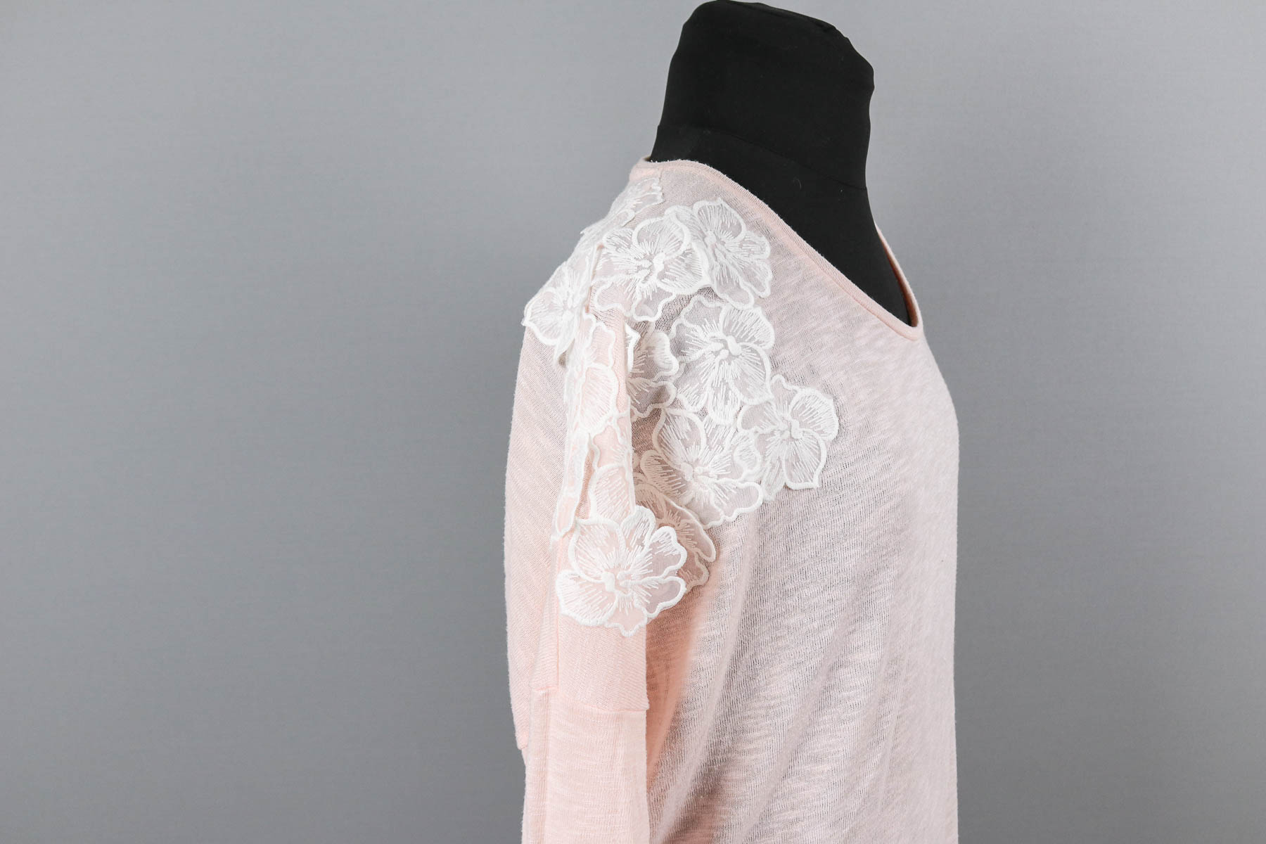 Wir verteilten die Spitzenblüten erst auf den beiden Flecken und vorn dort aus über das obere Vorder- und Rückenteil sowie auf dem Feldermausärmel. Dann probierte Susi das Shirt nochmal an. Ich steckte dann noch drei Blüten an den gegenüberliegenden Saum und fertig war die Verteilung.
