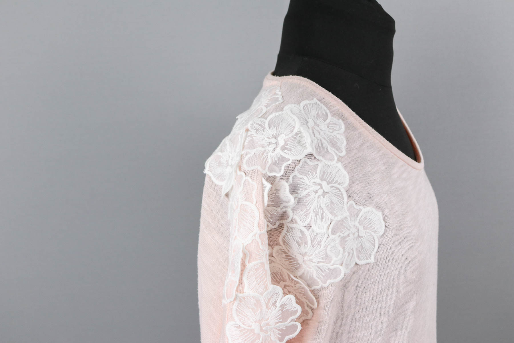 Naja, auf jeden Fall kramte ich das Shirt wieder raus und schaute nach Spitze. Ich muss sagen ich war schon nach einer Weile frustriert, gab es doch keine wirklich schöne Spitze bei meinen üblichen Stoffhändlern. Meist kamen ganze Stoffe oder Spitzenbänder, die ich für diesen Zweck nicht wirklich gebrauchen konnte. Im Nachhinein, habe ich wohl auch die falschen Suchbegriffe verwendet. Denn irgendwann gab ich dann Hochzeitsspitze* also Suchbegriff ein und das war genau das was ich bzw. wir für das Shirt brauchten. Es hat sich also gelohnt über den Tellerrand zu blicken