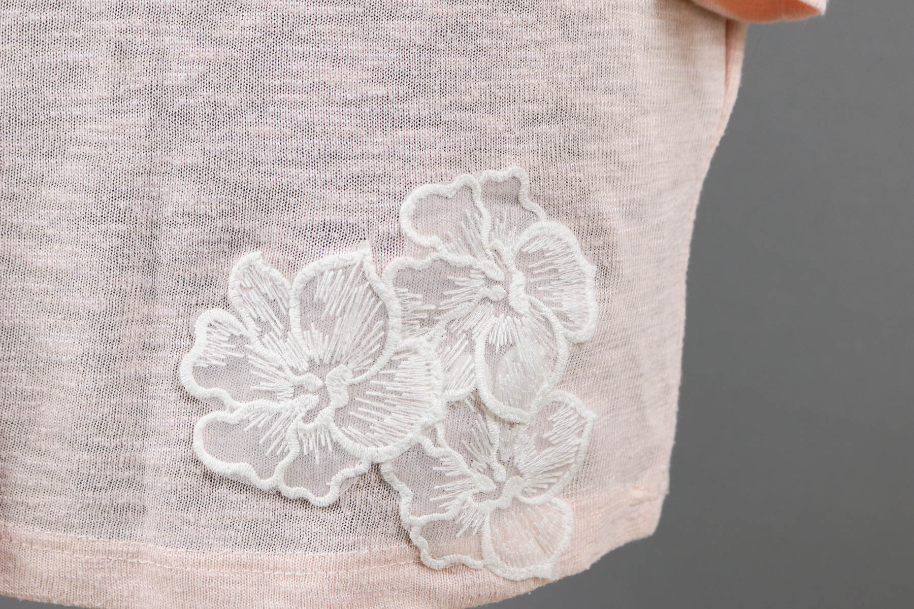 Als erstes testete ich an den drei Blüten am Saum, welchen Stich ich verwenden. Ich hatte den dreifachen Geradsstich im Kopf und nähten eine Blüte auch so an. Aber der Stich war mir zu präsent und so nähte ich die nächste Blüte mit einem einfachen Zickzackstich mit kleinerer Breite an. Das war nicht so präsent. Alle weiteren Blüten nähte ich mit diesem Stich an. Damit die Spitze nicht so angeklatscht aussieht, nähte ich die Blüten nie vollständig an, sondern ließ immer einen Teil locker. Ich legte mir für das Annähen Stickvlies unter die Blüten und mit dem Gewurschtel unter der Nähmaschine ging es auch.