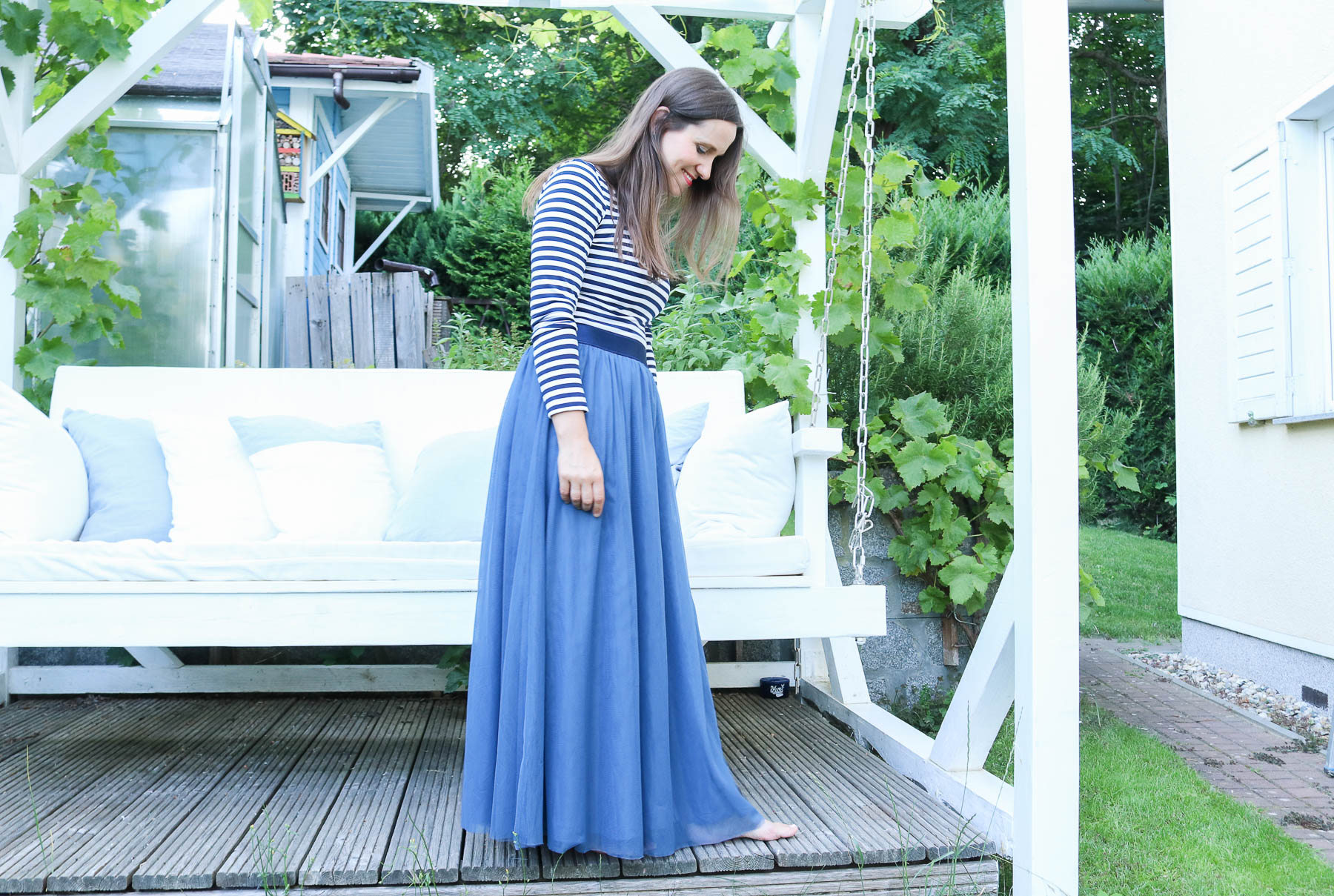 Und wie ihr mich kennt, bestellte ich den langen Tüllrock. Ich liebe einfach lange Röcke. Das Nähpaket kam schnell an und war echt niedlich verpackt. Überrascht war ich von dem Gummiband, das so weich ist, dass hätte ich nicht erwartet. Alles war da. Fast. Denn es kam mir in den Kopf noch ein Oberteil für den Tüllrock zu nähen und hier suchte ich mir eine blau-weiß gestreiften Viskose* aus.