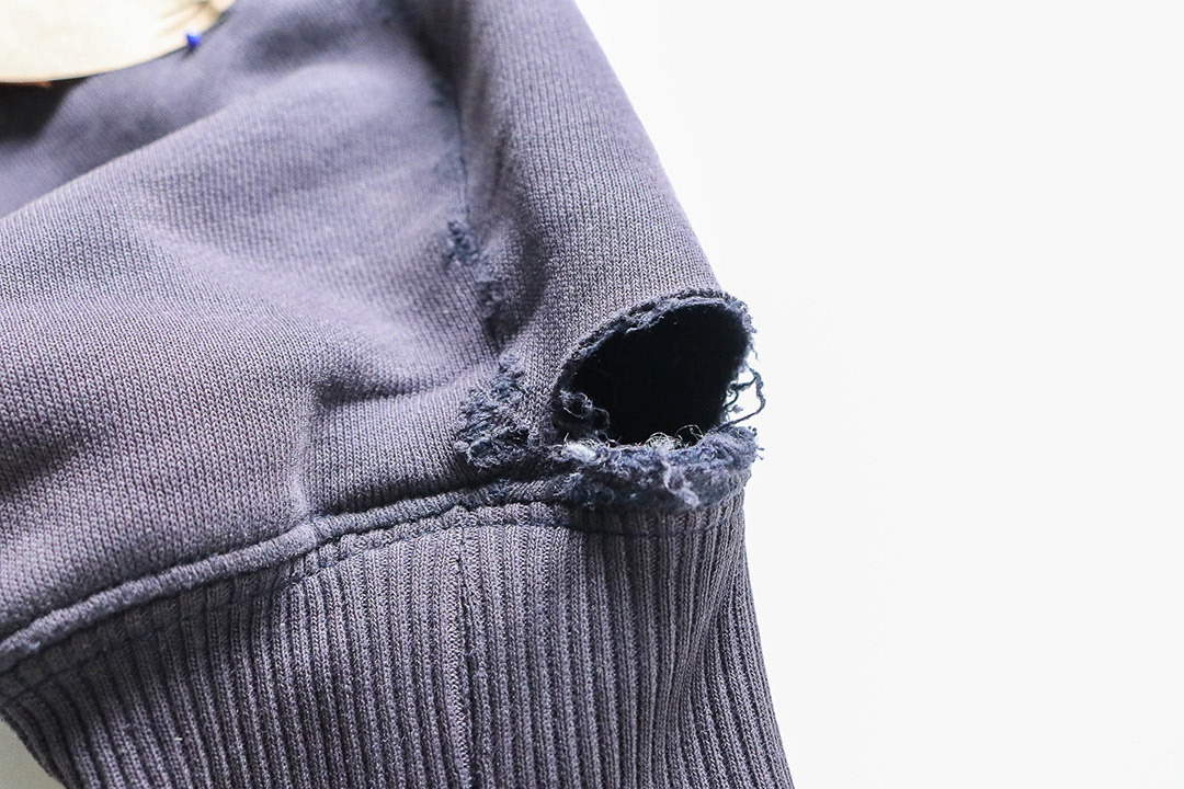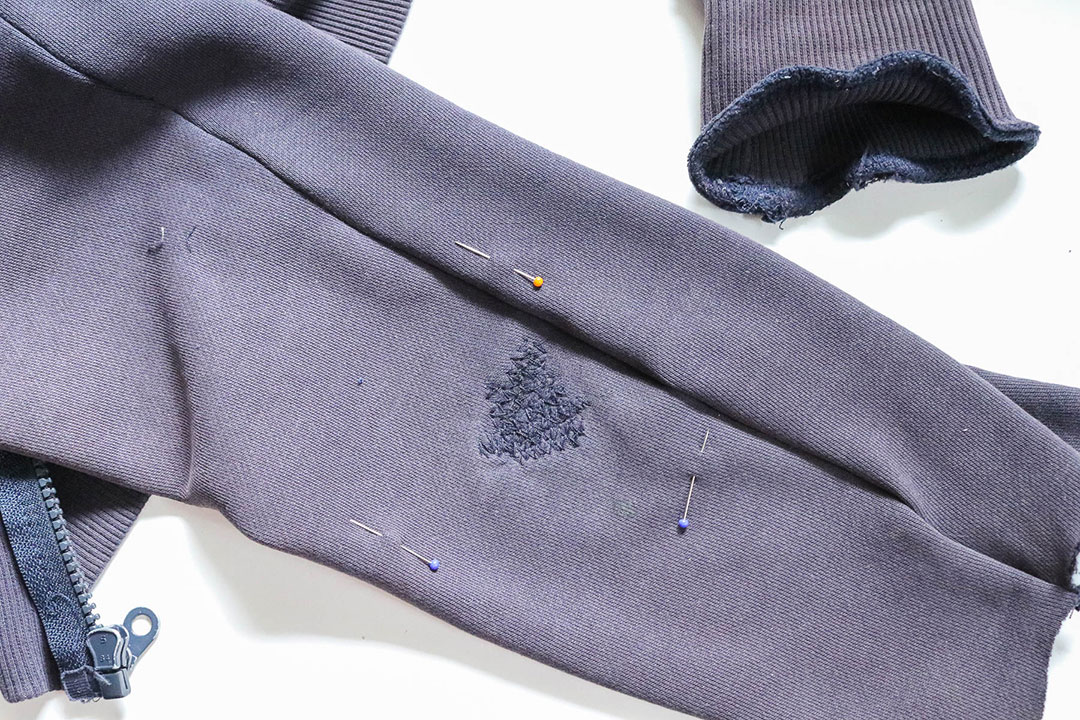 Ich schnitt also die Bündchen ab und trennte den Ärmel mit dem Loch etwas auf, so dass ich das Loch flicken konnte. Wie bei den Löchern in den Jeanshosen…