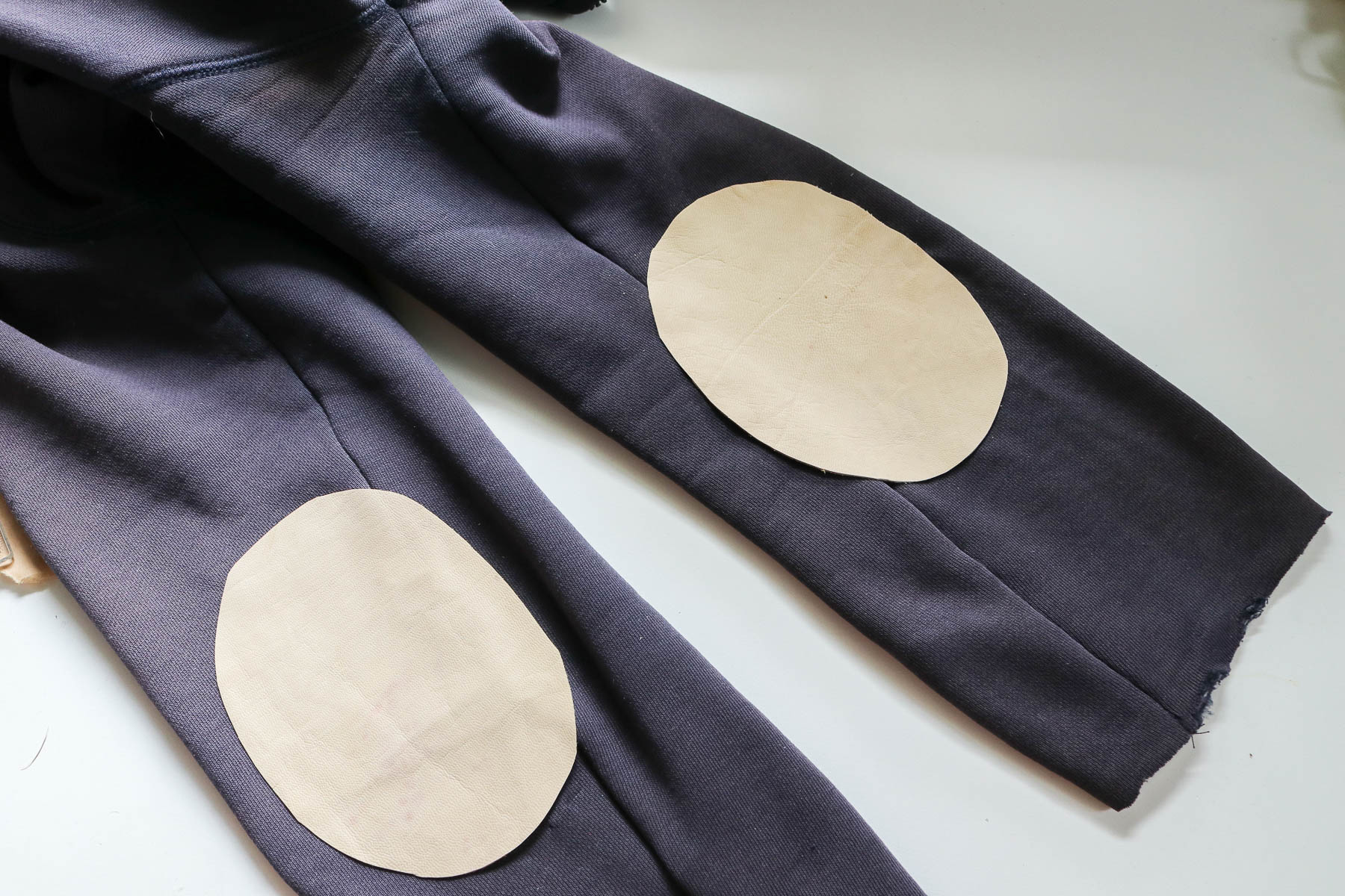 Dann nähte ich die Ärmel wieder zu und schnitt mir zwei Lederpatches zu. Diese positionierte ich mir auf den Ellenbogen – ich trug dazu die Jacke und steckte mir dann Nadeln in den Ärmel.
