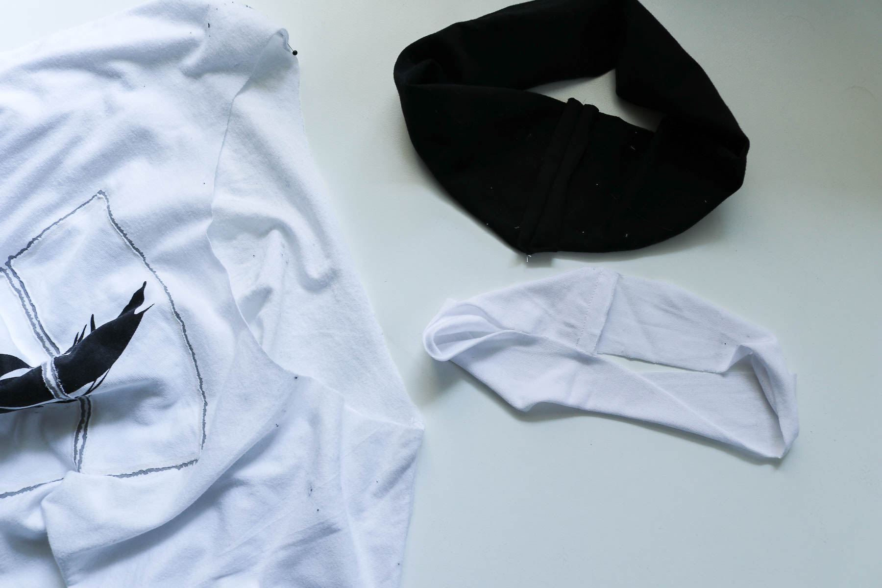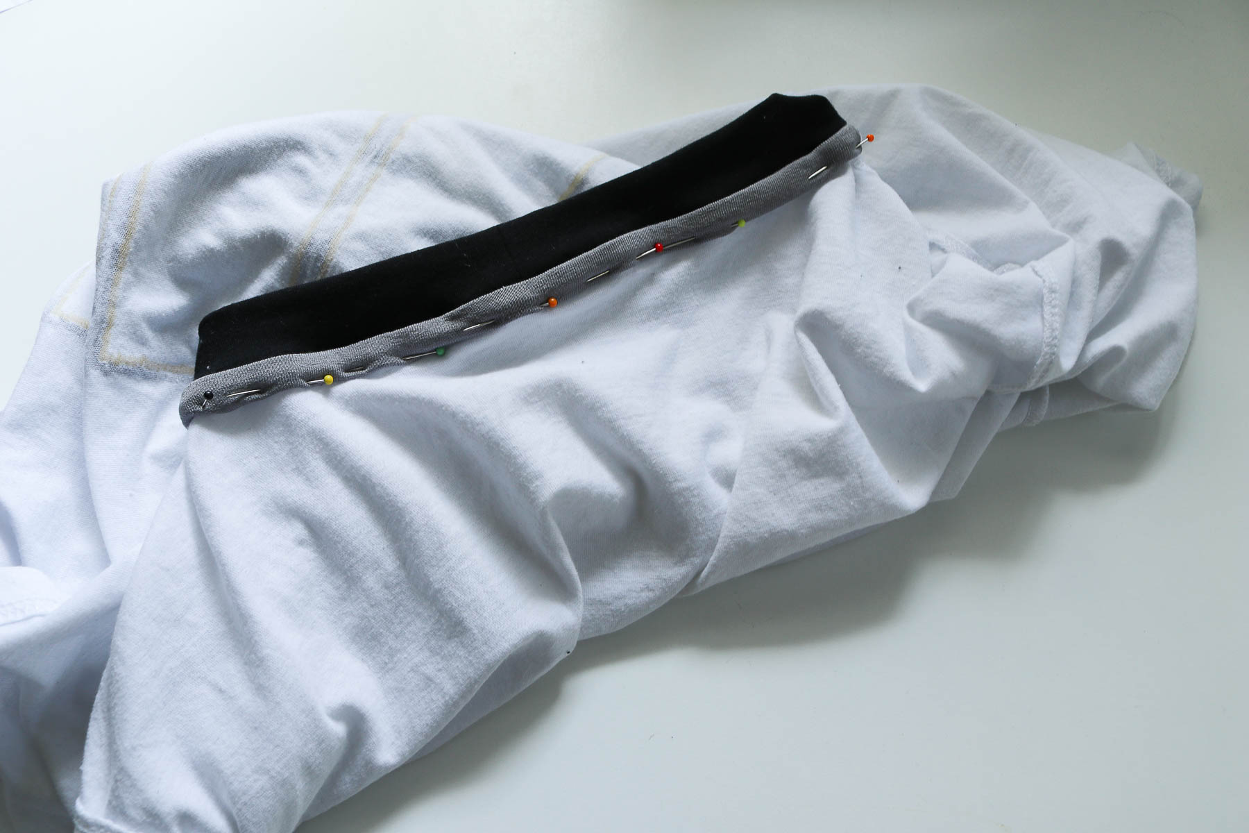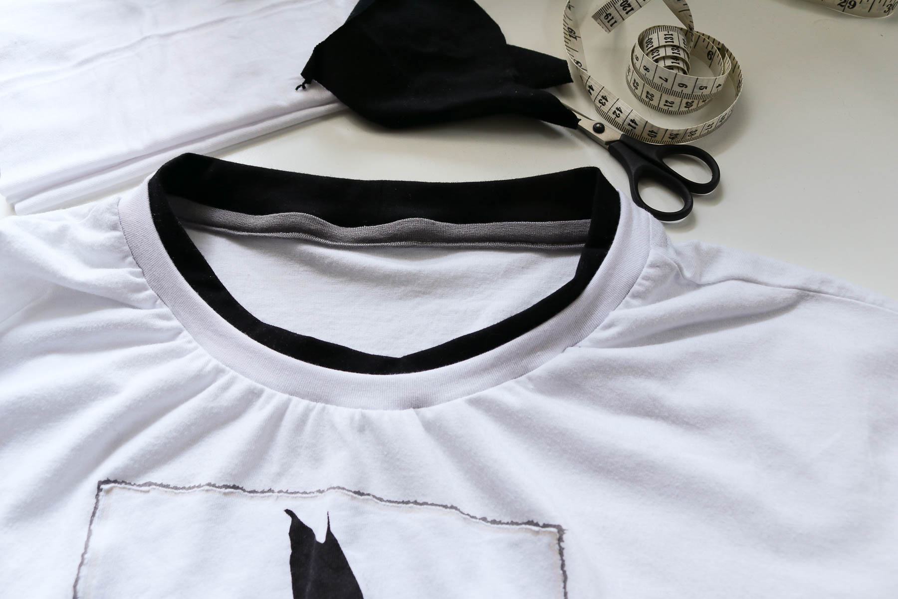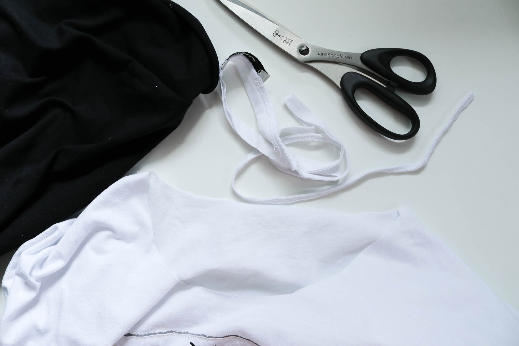 Ich schnitt also nur das alte Bündchen ab und maß mir dann die Länge des Halsbündchen aus. Mit der Formel Länge des Halsausschnittes x 0,7 schnitt ich dann die beiden Halsbündchen aus dem weißen und schwarzen Jersey zu, wobei der schwarze Jersey doppelt so breite ist wie der weiß, damit er später noch zu sehen ist.