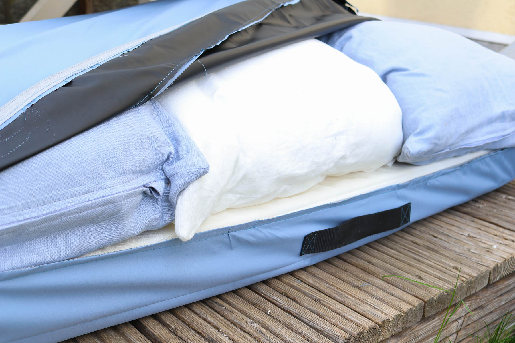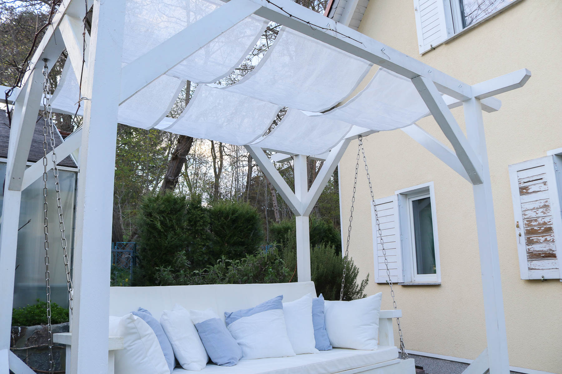 Eines meiner größeren Nähprojekte waren die Auflagen, die Kissen inkl. deren Aufbewahrung und die Sonnensegel für unsere Gartenschaukel. Es hat mir wirklich Freude gemacht, die ganzen Sachen so zu nähen, wie ich mir sie auf der Gartenschaukel vorgestellt habe und das es dann auch noch so geworden ist. Ich bzw. wir lieben diesen Ort – er ist gemütlich und hat etwas von Urlaub.